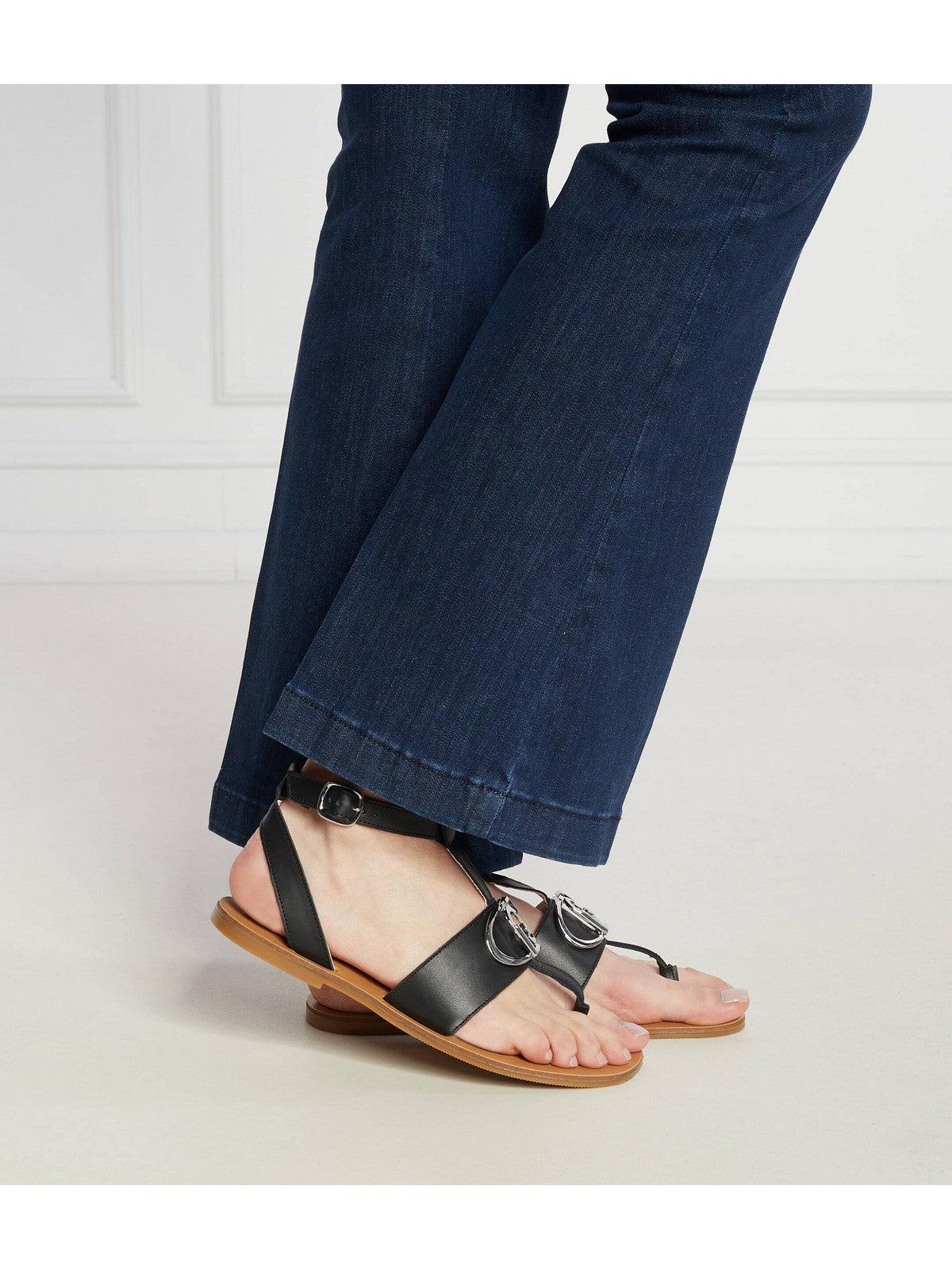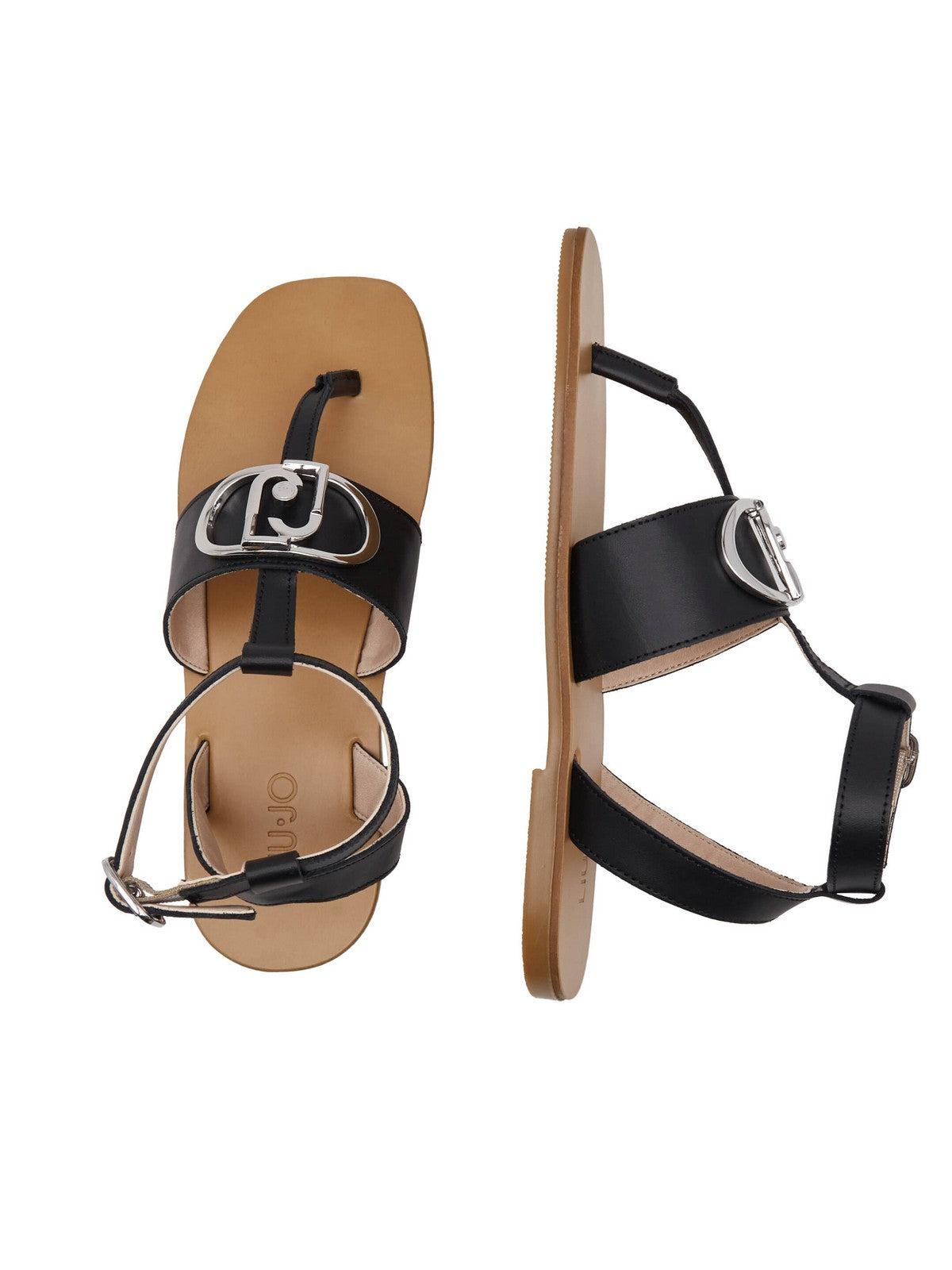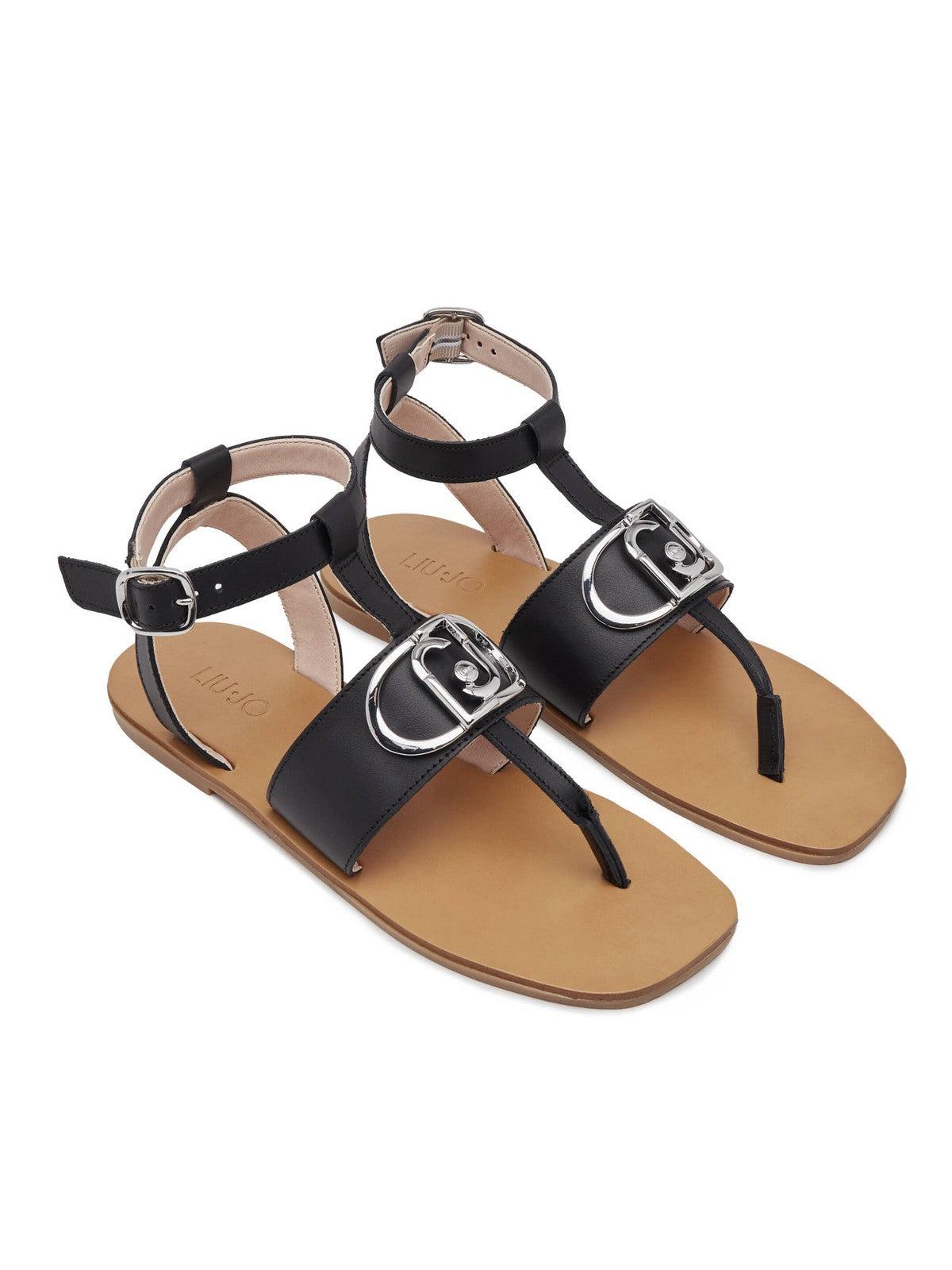 Sandalo basso LIIU JO con tomaia in pelle. Maxi logo in metallo sul fronte. Modello infradito. Cinturino da allacciare alla caviglia con fibbia regolabile. Suola alta 1 cm.