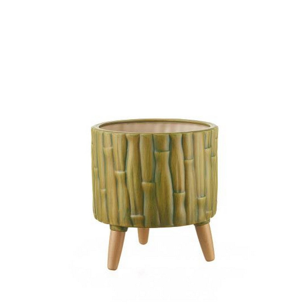Cache-pot basso in ceramica lavorata con piedini in legno. Vaso da interni, che si ispira alle geometrie del bambù, perfetto per arredare la casa con un angolo verde. Da abbinare alla versione alta d'ispirazione Ethno Chic per un arredamento dallo stile jungle.