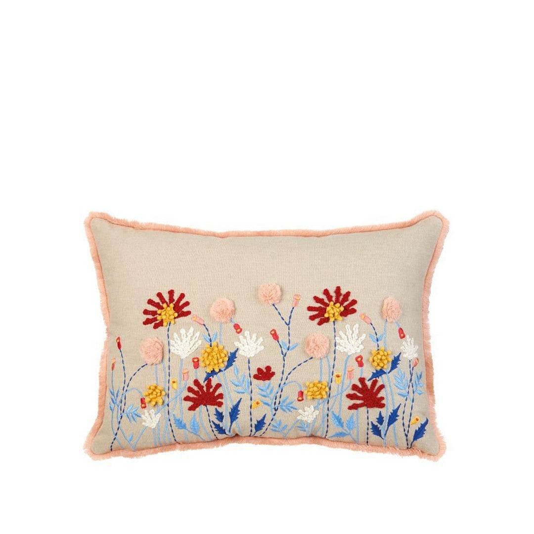 Cuscino arredo rettangolare in cotone con applicazioni e ricami. Il moderno decoro floreale e una texture materica piacevole al tatto lo rendono il dettaglio che veste di eleganza il living. Ideale da abbinare al cuscino quadrato con decoro floreale e il cuscino con decoro geometrico coordinati dell'ispirazione Modern Country. Sfoderabile.