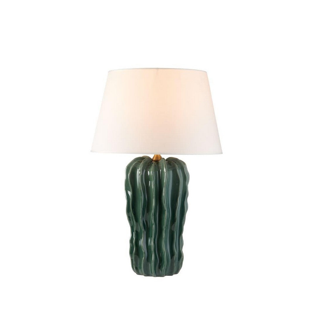 Lampada da tavolo in porcellana con paralume in lino. La sua forma che celebra le piante grasse, rende questo complemento perfetto per un living dal design originale.