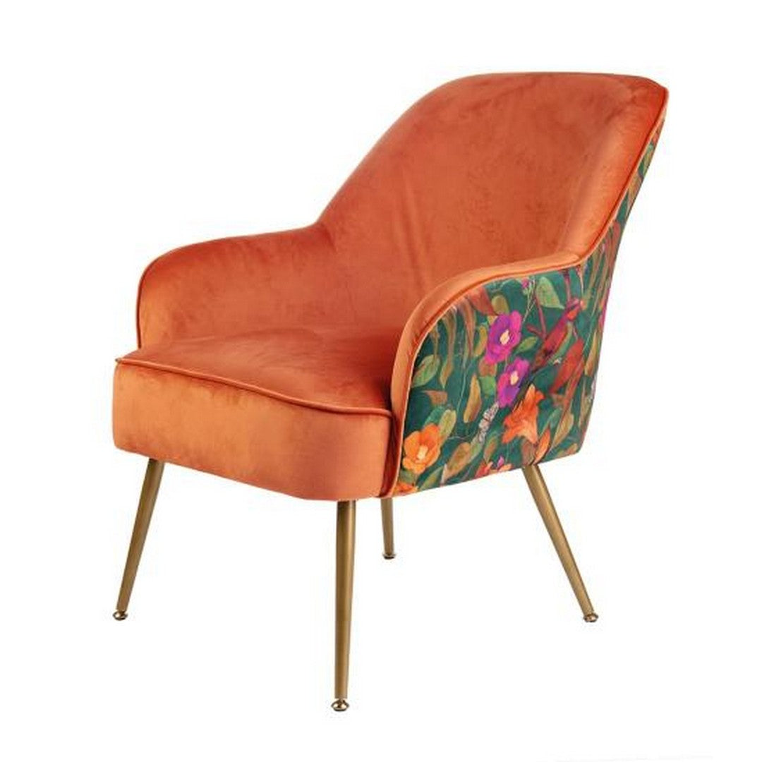 Poltrona con decoro floreale ed uccelli. Accogliente e resistente grazie a struttura in legno e gambe in metallo dorato. Perfetta da abbinare al pouf con lo stesso decoro per creare un ambiente dalla personalità vivace ed elegante.