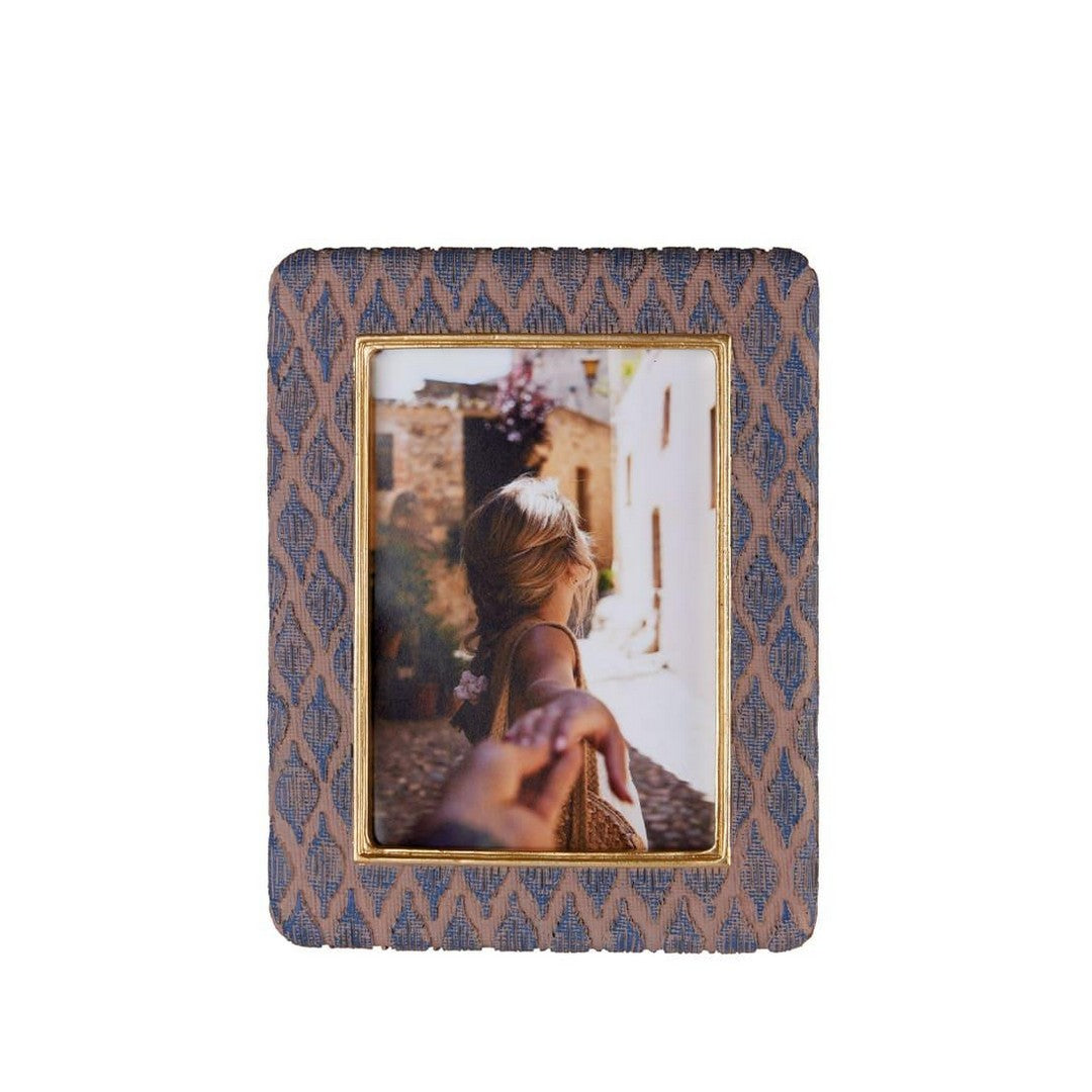 Portafoto rettangolare in resina dal decoro geometrico e dettagli dorati. Una finestra sui ricordi più importanti, per vestire di emozioni la casa. Disponibile anche versione piccola.