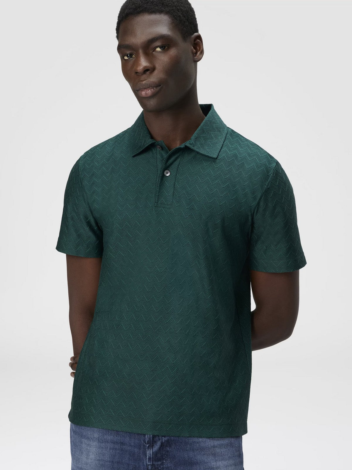 Questa polo Missoni combina l'eleganza della costruzione sartoriale con la leggerezza dei materiali pregiati. Il tessuto in cotone, impreziosito da un motivo zig zag, conferisce al capo una raffinatezza contemporanea, perfetta per un look estivo fresco ma ricercato.