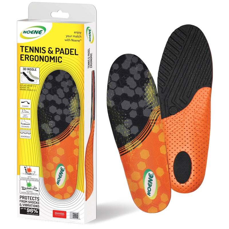 Plantari Noene Ergonomic Sport per il tennis ed il padel, ideali per chi pratica attività intense e dinamiche come i giocatori di padel , beach padel, pickleball e tennis . I plantari 3D INSOLE TENNIS & PADEL ERGONOMIC hanno un doppio strato AIRFOAM ed E.V.A per assicurare al piede comfort ed elasticità. Inoltre la forma ergonomica del rinforzo in E.V.A (arancione), guida il tallone e la volta plantare nei cambi di direzione e nei salti. Proteggono con uno strato di 1 mm di Noene ® a tutta lunghezza e un inserto specifico per il tallone, per un totale di 5mm. La base tridimensionale migliora l'aderenza all'interno della calzatura, donando stabilità al piede e una performance migliore. Sostituiscono la soletta originale (3D INSOLE). Salbini articoli tecnici per lo sport è rivenditore ufficiale di plantari Noene .