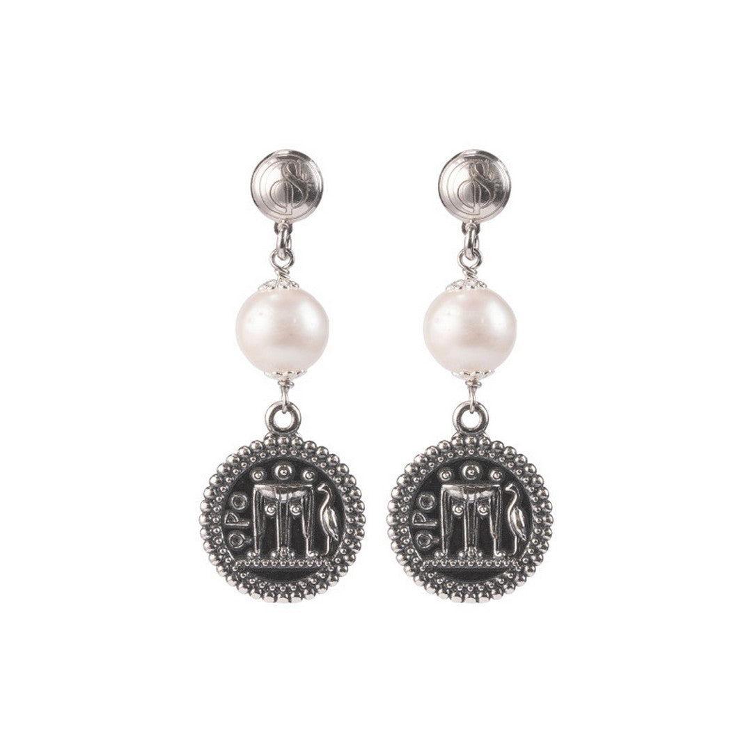 Orecchini pendenti dalla delicata e raffinata manifattura. Una moneta in argento, accompagnata da un'elegante perla per rendere sofisticata ogni tua mise.