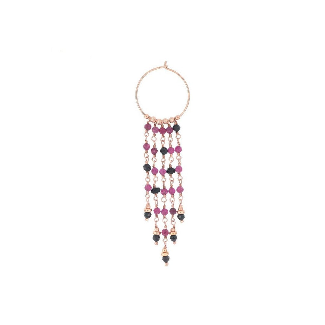 Orecchino a cerchio singolo con cascata di catene e pietre di Rubino e Spinello realizzato in argento 925 con galvanica oro rosa ad alto spessore e resistenza.