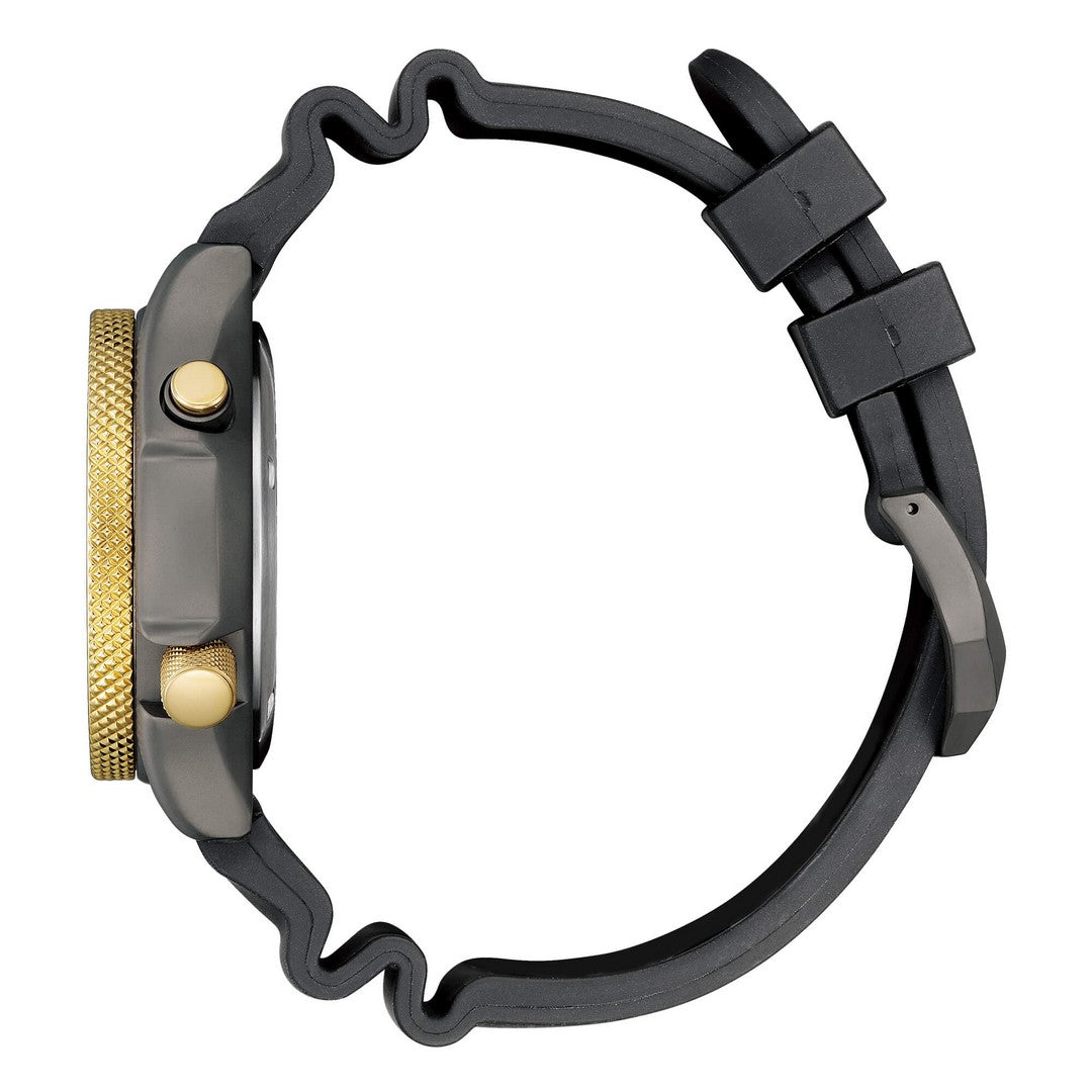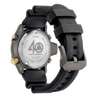 Cassa in acciaio inossidabile con finitura grigia e dettagli dorati. Cinturino in BENEBiOL?, poliuretano di origine vegetale. Fondello celebrativo con incisione del logo 40° Anniversario. Indici e sfere ad alta visibilità. Fondo e corona serrati a vite. Ghiera girevole unidirezionale zigrinata. Vetro minerale. WR 20 bar.
