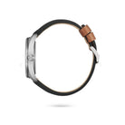 Cassa in Super Titanio. Cinturino in pelle. Fondello serrato a vite. Vetro zaffiro. WR 10 bar.