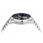 Quadrante analogico blu con movimento a vista nella parte bassa, indici a bastoni dorati e logo a ore 12.