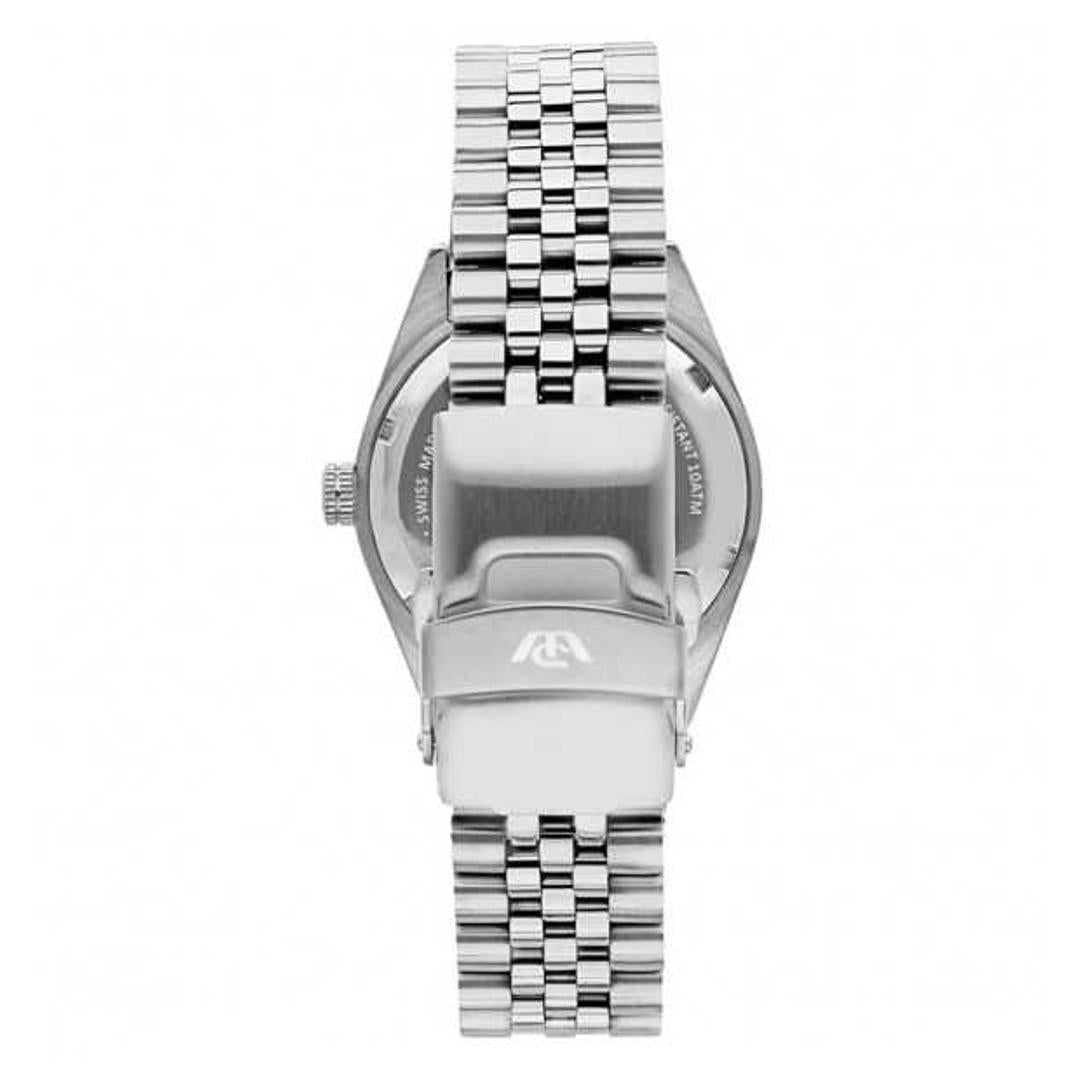 Quadrante bianco con indici a numeri romani, logo a ore 12 e datario a ore 3 con lente di ingrandimento. Vetro zaffiro.