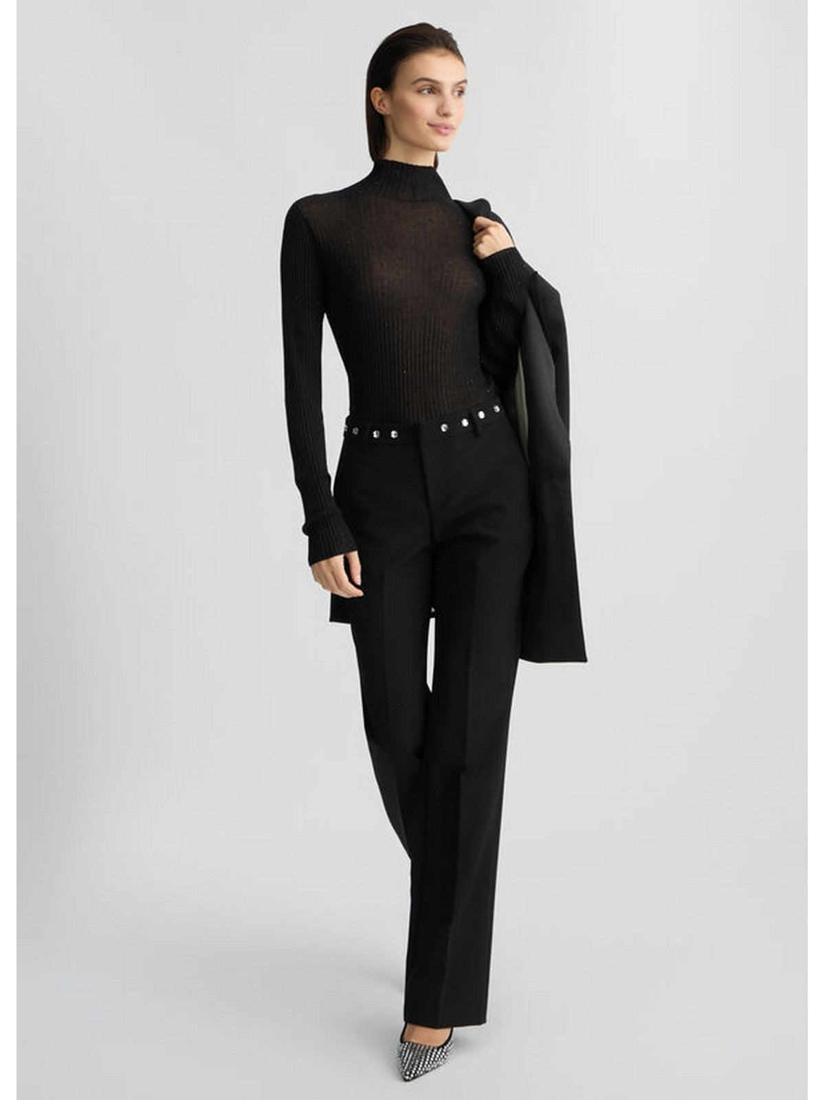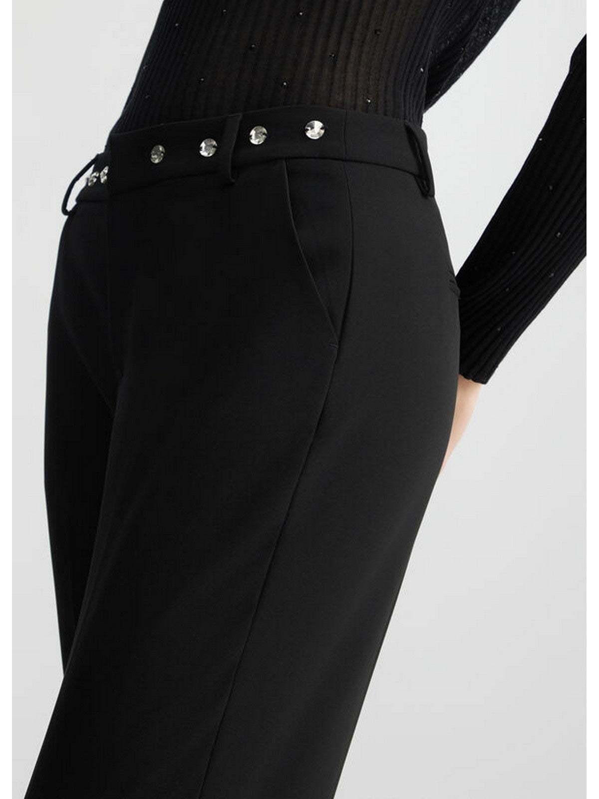 Esalta la tua eleganza con questi pantaloni neri d'ispirazione sartoriale, arricchiti da brillanti castoni gioiello sul davanti. Un perfetto mix di classe e dettagli luminosi che non passa inosservato.