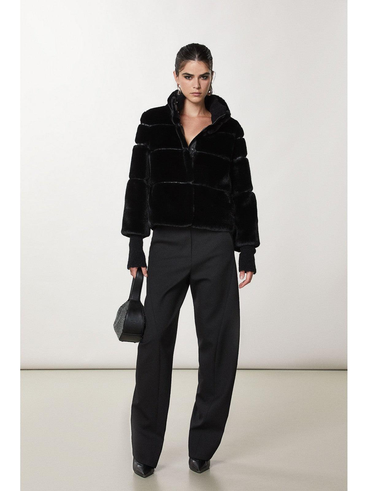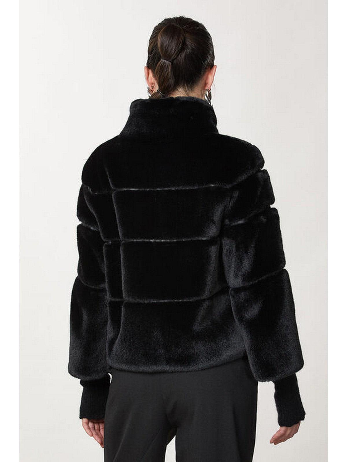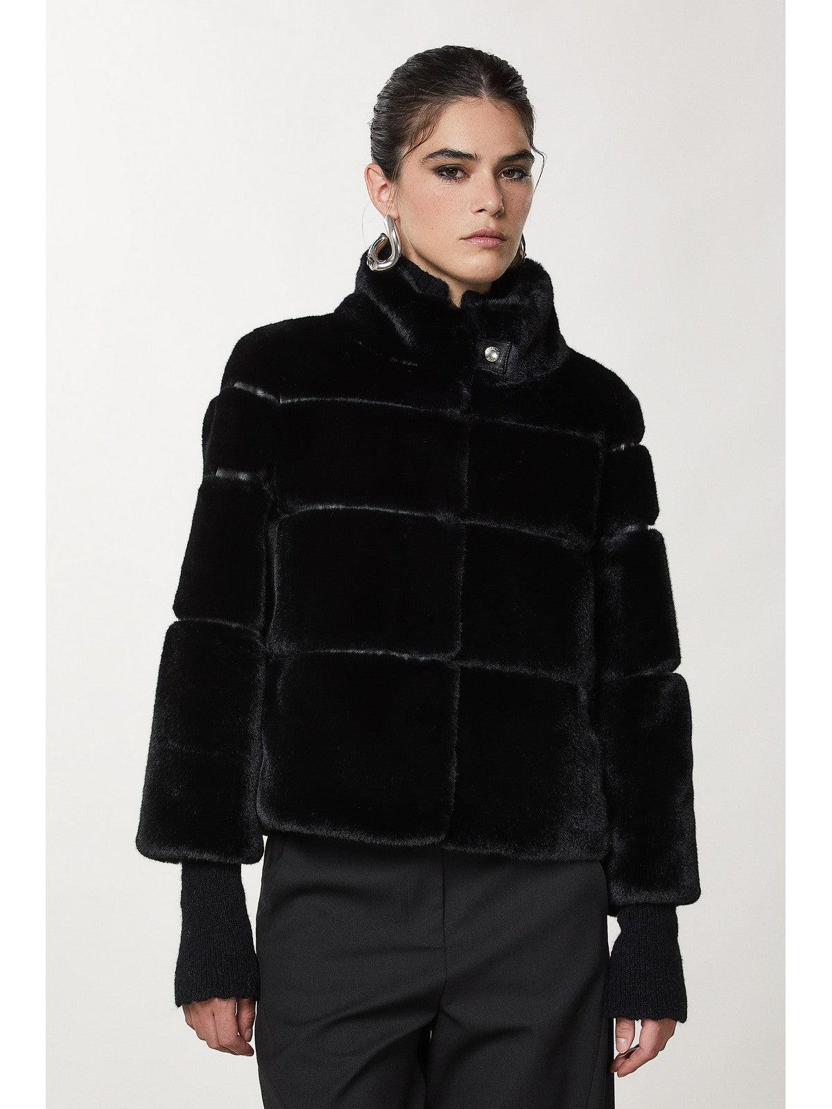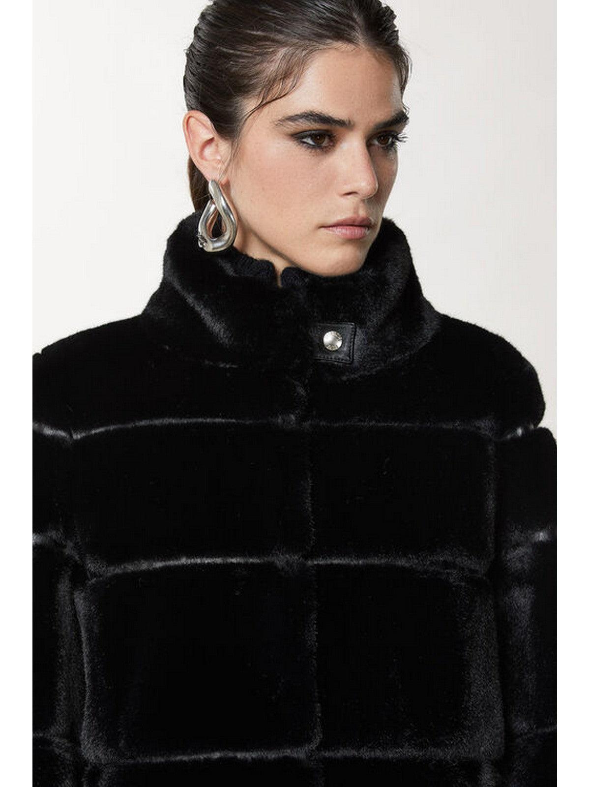 Pelliccia PATRIZIA PEPE in tessuto sintetico, intarsi in tessuto spalmato per corpo e maniche. Collo e polso alto tipico Patrizia Pepe in maglia. Chiusura con bottoni automatici.