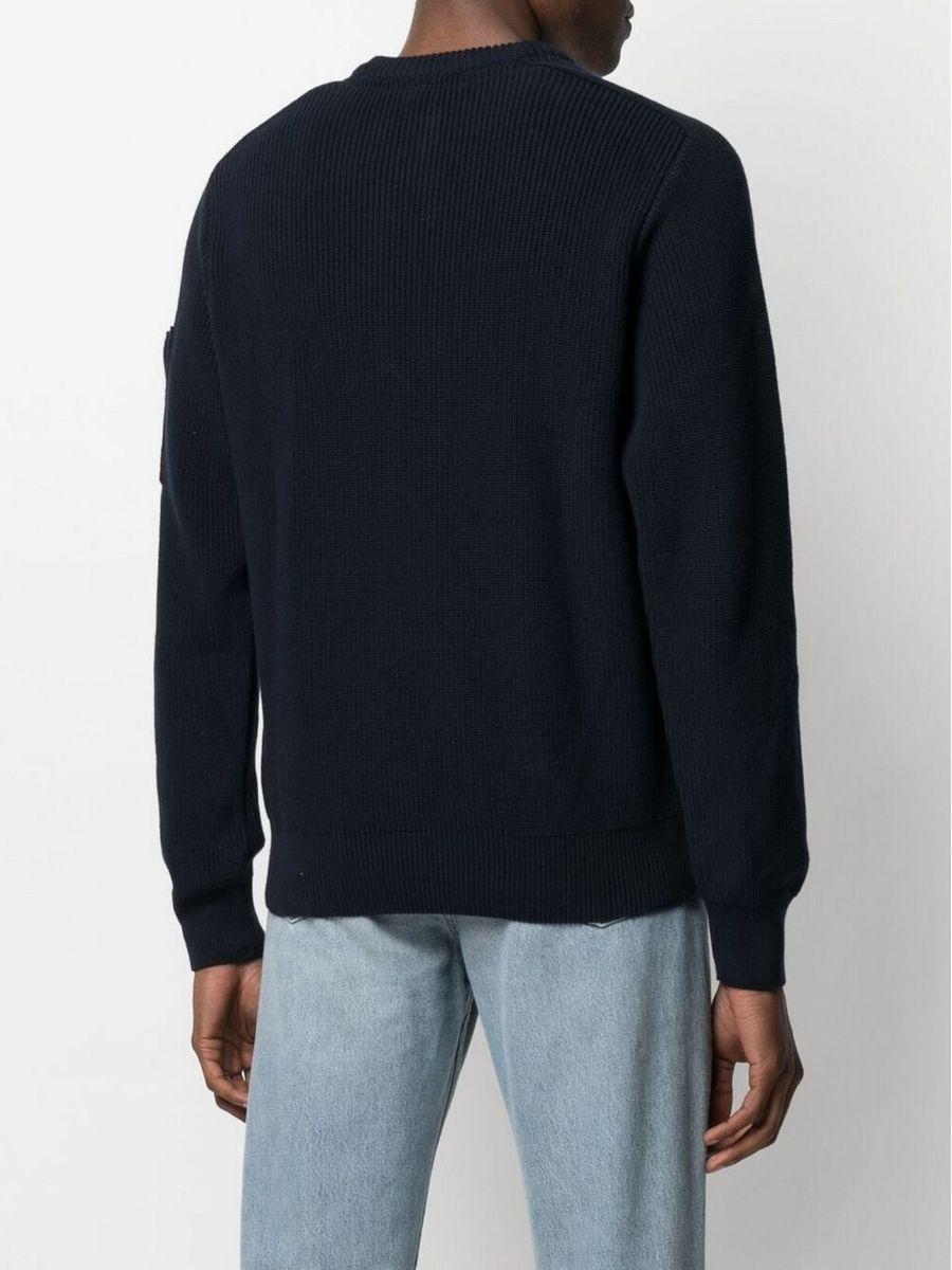 Tasca applicata sulla manica, applicazione sulla manica con logo, girocollo, maniche lunghe e design lavorato a maglia. Materiale: cotone biologico.
