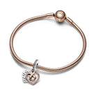 Argento Sterling 925 e esclusiva lega metallica placcata Oro Rosa 14K 20 micro zirconia cubica rosa sul passante incastonatura a pavè, 24 micro zirconia cubica e 1 zirconia cubica rosa nella parte centrale del pendete; zirconia cubica rosa fiabesco tagli