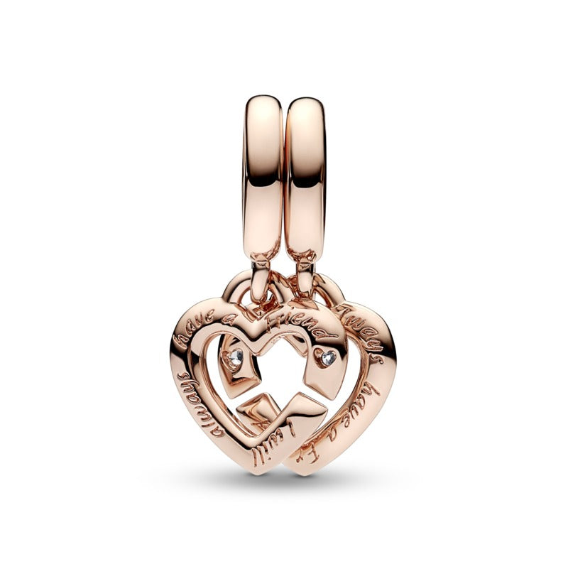 Pandora Pendente Sorelle, esclusiva lega metallica placcata oro rosa 14k; 2 zirconia cubica incolore taglio brillante, incastonatura a filo