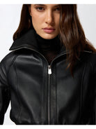 Giubbino corto PINKO dalla linea aderente e femminile, caratterizzato da corpo in morbida nappa abbinato a un maxi bordo inferiore in maglia lavorata a costine.