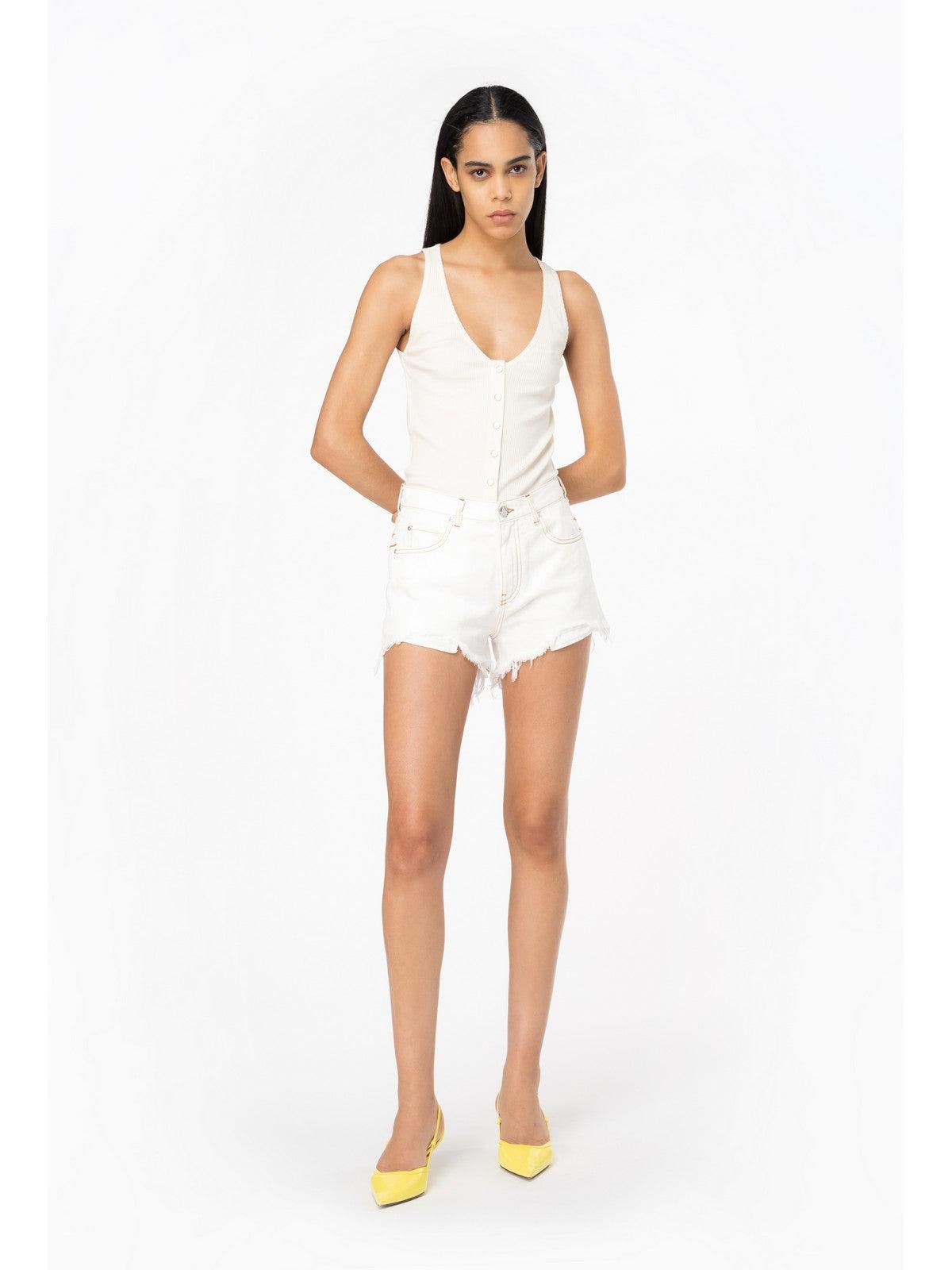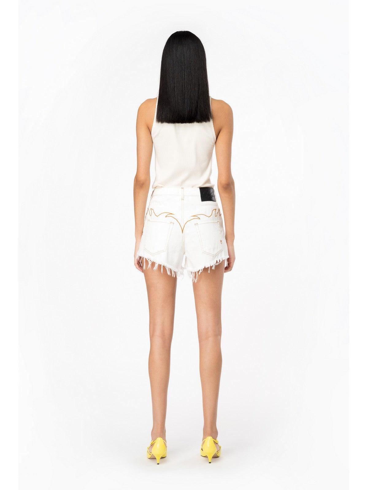 Pantaloncini shorts PINKO in bull di cotone slegato, dalla particolare mano morbida. Modello cinque tasche. Vita alta con passanti per cintura, ricamo dal motivo tribale sul retro e gamba con fondo sfrangiato. Chiusura con zip e bottone a chiodo in metallo.