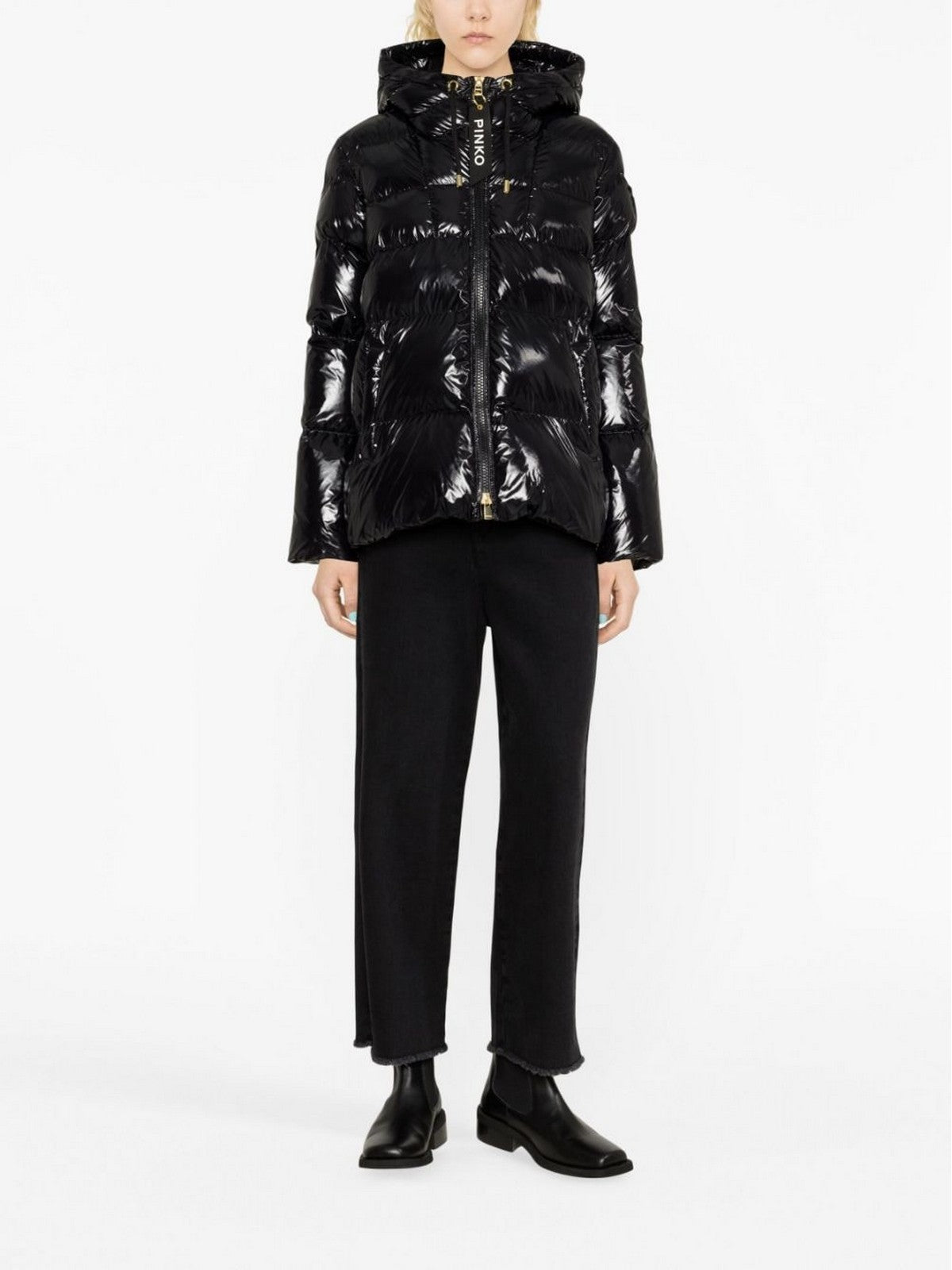 Piumino PINKO in tessuto crystal nylon, dal particolare finishing lucido. Imbottitura ecologica. Collo a cappuccio con coulisse a cordino con finalino in metallo, maniche lunghe e tasche a filetto verticale sui fianchi. Foderato. Chiusura con zip in metallo davanti, doppio cursore, di cui uno personalizzato con nastro logato.