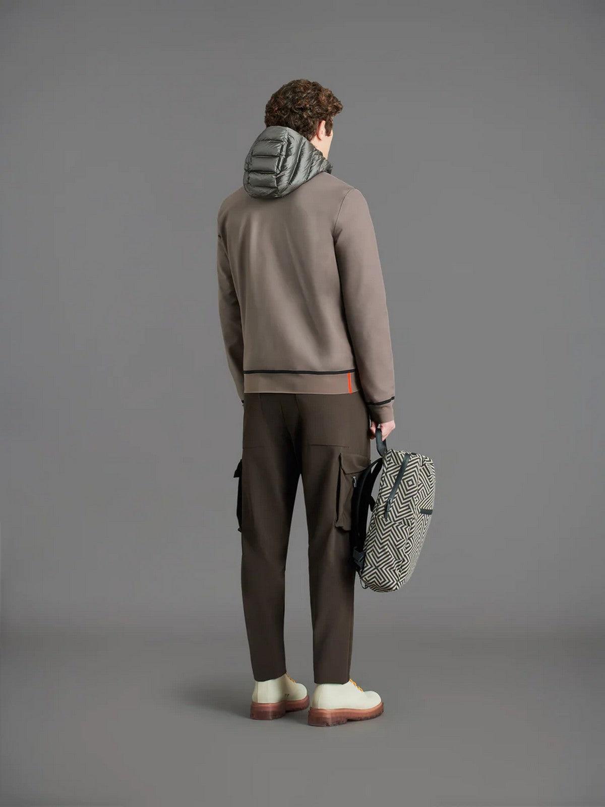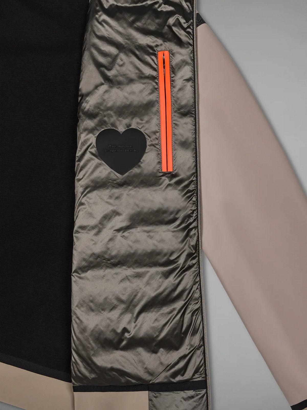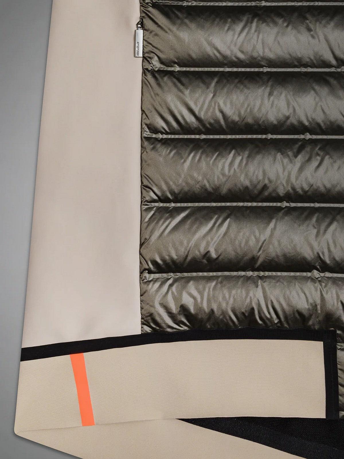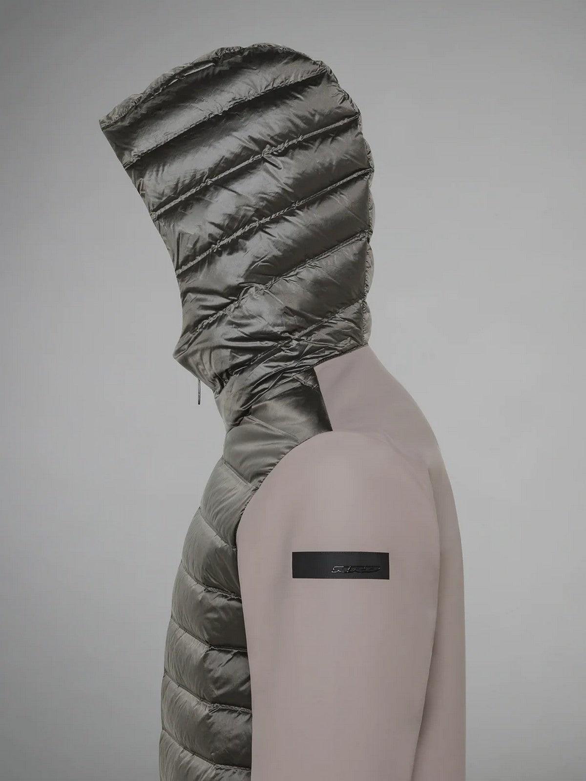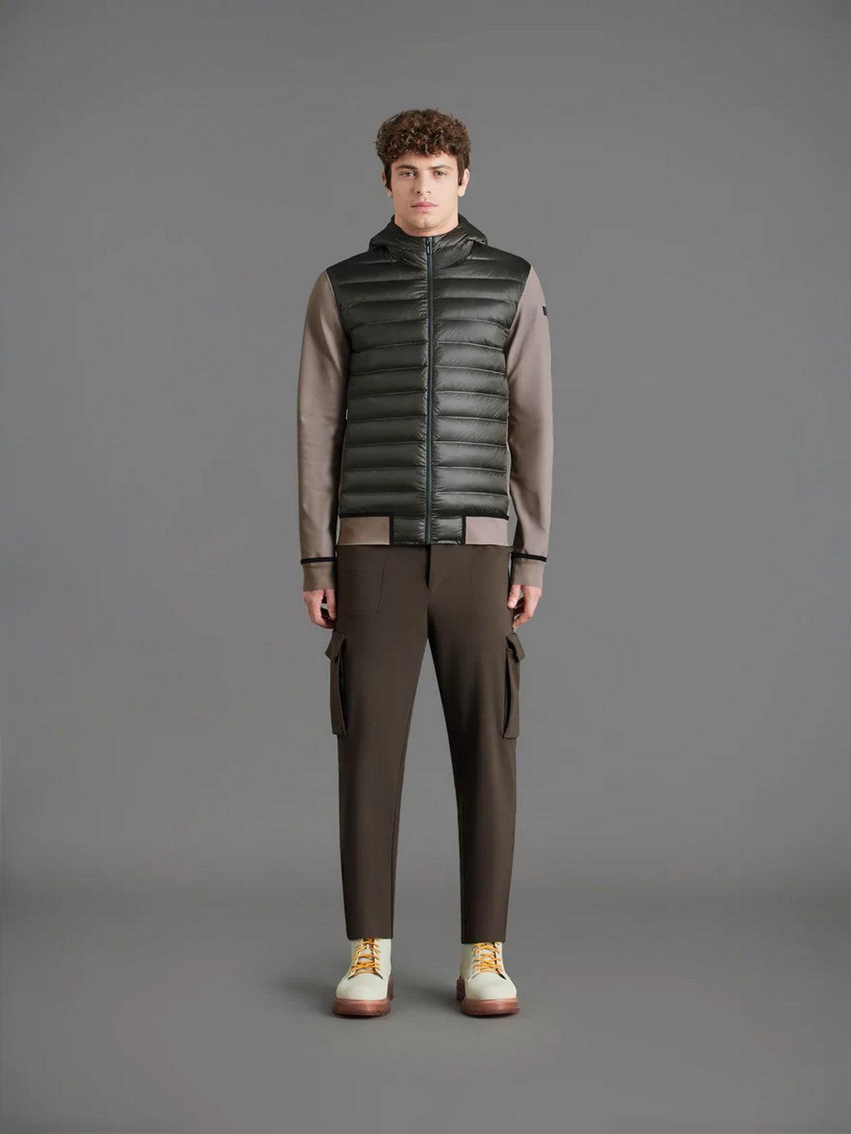 Giubbino RRD trapuntato a righe orizzontali sul fronte e in tessuto impermeabile sul retro. Interno con imbottitura in piuma d'anatra 90/10. Collo con cappuccio e maniche lunghe. Chiusura con zip integrale. Tasche sui lati zippate.