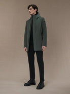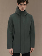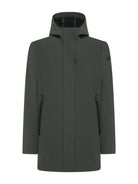 Chiusura con patta chiusa da bottoni a pressione invisibili nasconde la chiusura a zip integrale a doppio cursore, che sale a chiudere il colletto e il cappuccio fisso avvolgente.