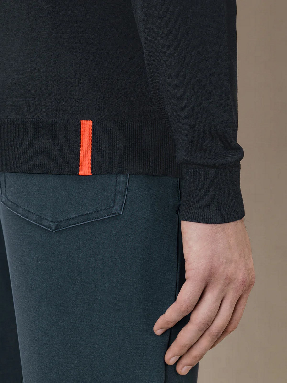 Rifinito dalla lavorazione a sottili coste elasticizzate del colletto, dei polsi e del fondo, impreziosito dall'iconico filetto arancione.