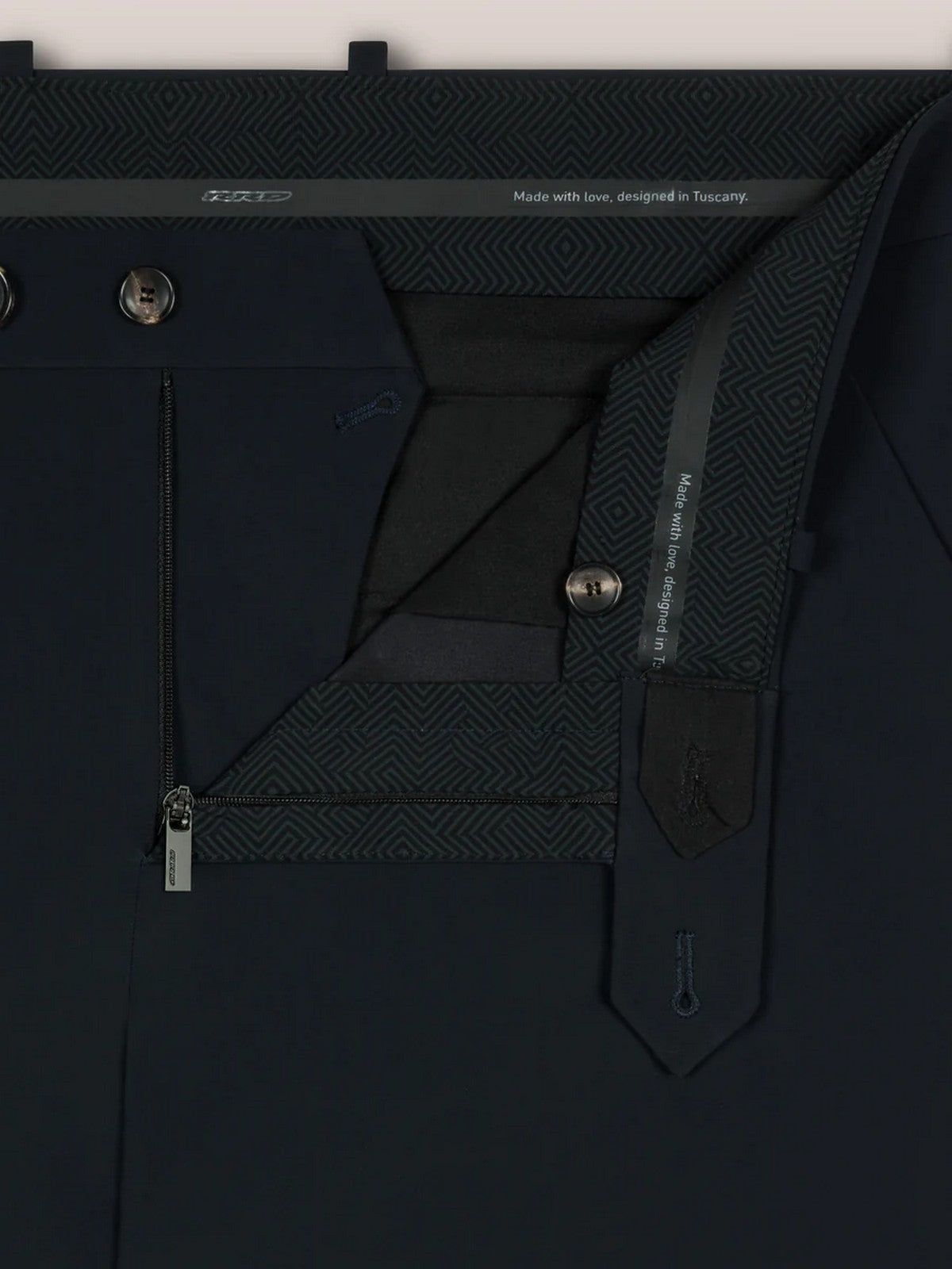 Cintura a passanti regolazione a doppio bottone in corno e la chiusura sul davanti a zip nascosta dalla pattina.