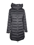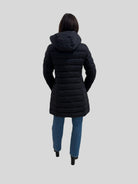 Piumino lungo SAVE THE DUCK realizzato in tessuto a tinta unita isolato in nylon opaco, trapuntato a righe orizzontali.