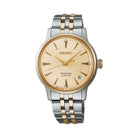 Eleganza dorata e charme femminile: il Seiko Presage Cocktail Donna SRPL64J1 si ispira ai toni caldi e vellutati del Frozen Banana Daiquiri. Il quadrante dorato, arricchito da quattro diamanti e riflessi satinati, è incorniciato da una cassa in acciaio da 34 mm, per un look sofisticato e solare. Il Seiko SRPL64J1 viene consegnato con scatola e garanzia di 3 anni (internazionale).
