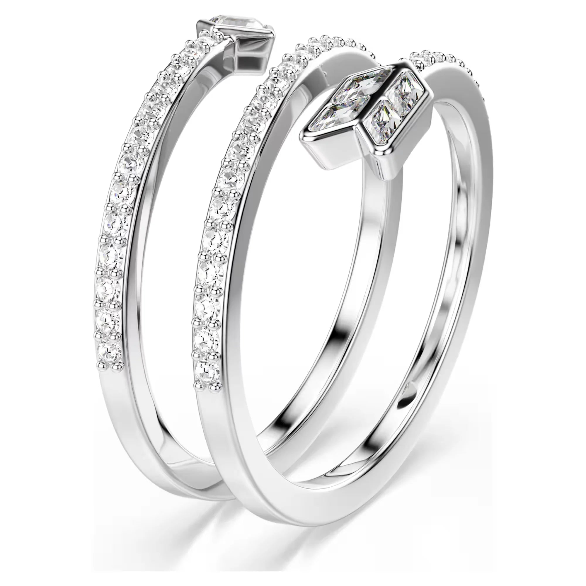 Fai innamorare il tuo stile con l'anello a spirale a forma di freccia di Cupido. Il design unico combina l'elegante placcatura rodio con cristalli Cry rotondi, dando vita a un look di pura passione vorticosa. Indossalo da solo o abbinalo ad altri gioielli a forma di freccia della stessa famiglia Idyllia.