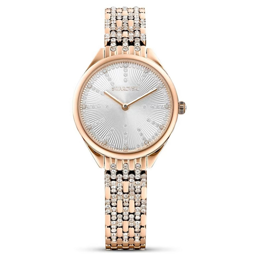 Un orologio ultra-chic, progettato in acciaio inossidabile con rivestimento PVD in tonalità oro rosa. Elegante e sorprendente, il morbido bracciale in metallo è rifinito con oltre 150 cristalli trasparenti. Il quadrante in stile guilloché è decorato con indici in cristallo dallo stile contemporaneo per aggiungere un tocco più lussuoso al design. Prodotto in Svizzera, è resistente all'acqua fino a 50 metri. Ideale da indossare ogni giorno e da sfoggiare la sera. Fabbricato in Svizzera.