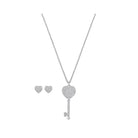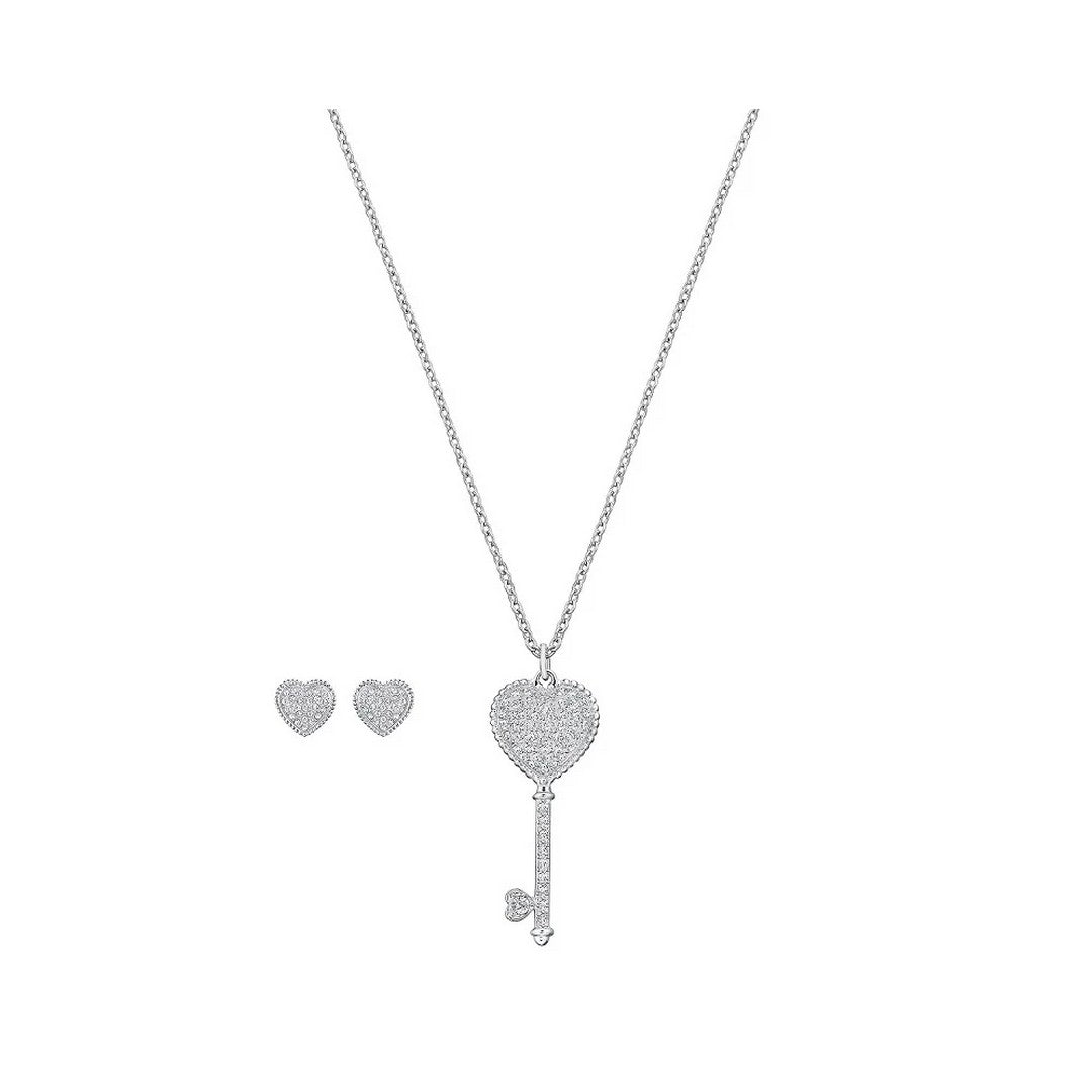 Set gioielli collana in metallo rodiata chiave pendente con orecchini lobo forma cuore in pavè di cristalli bianchi
