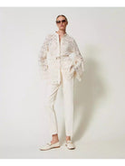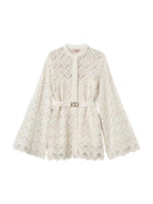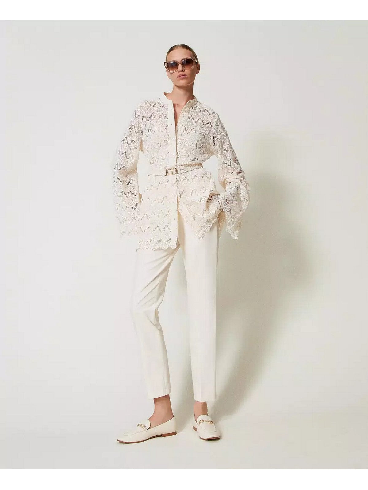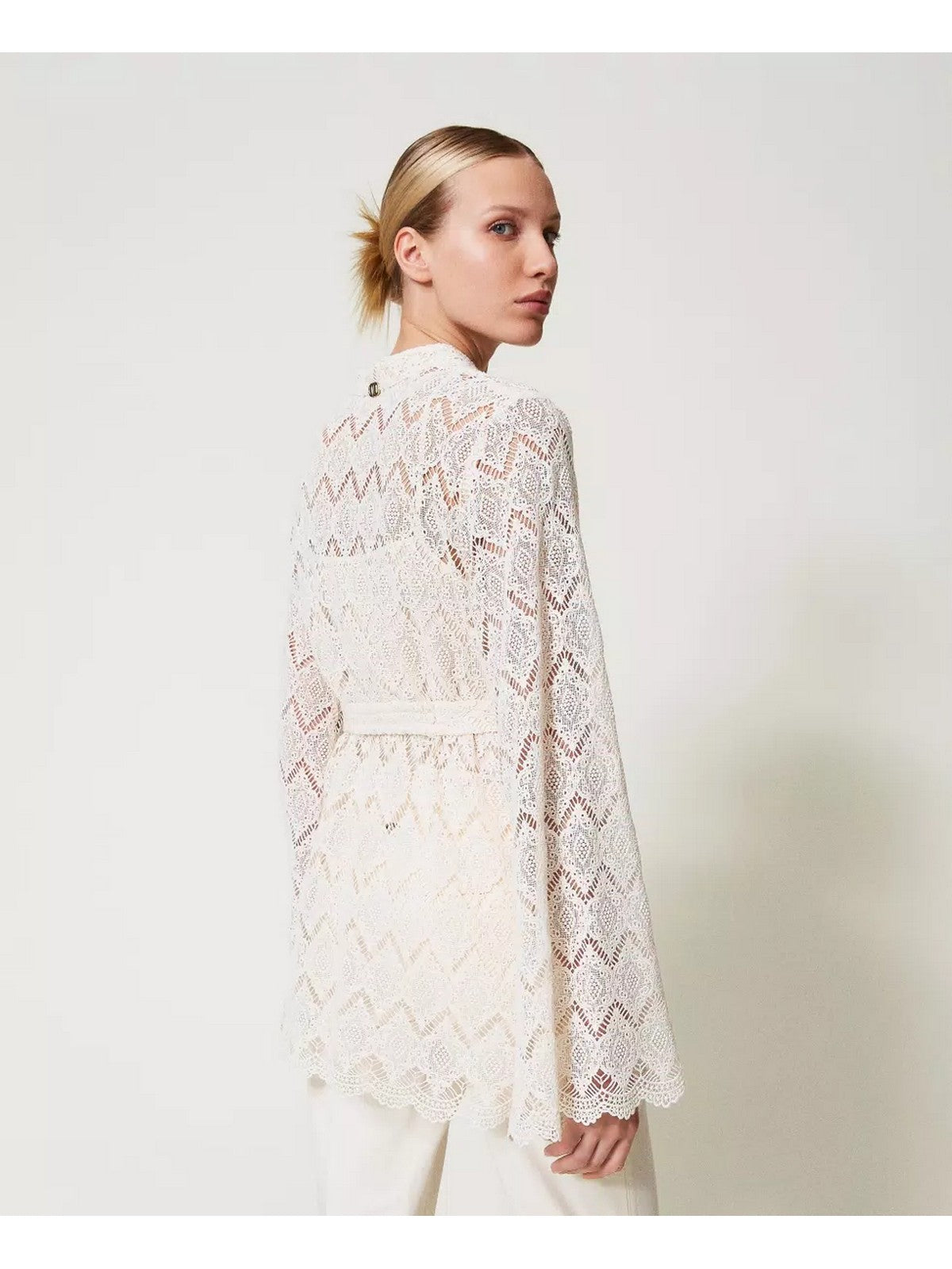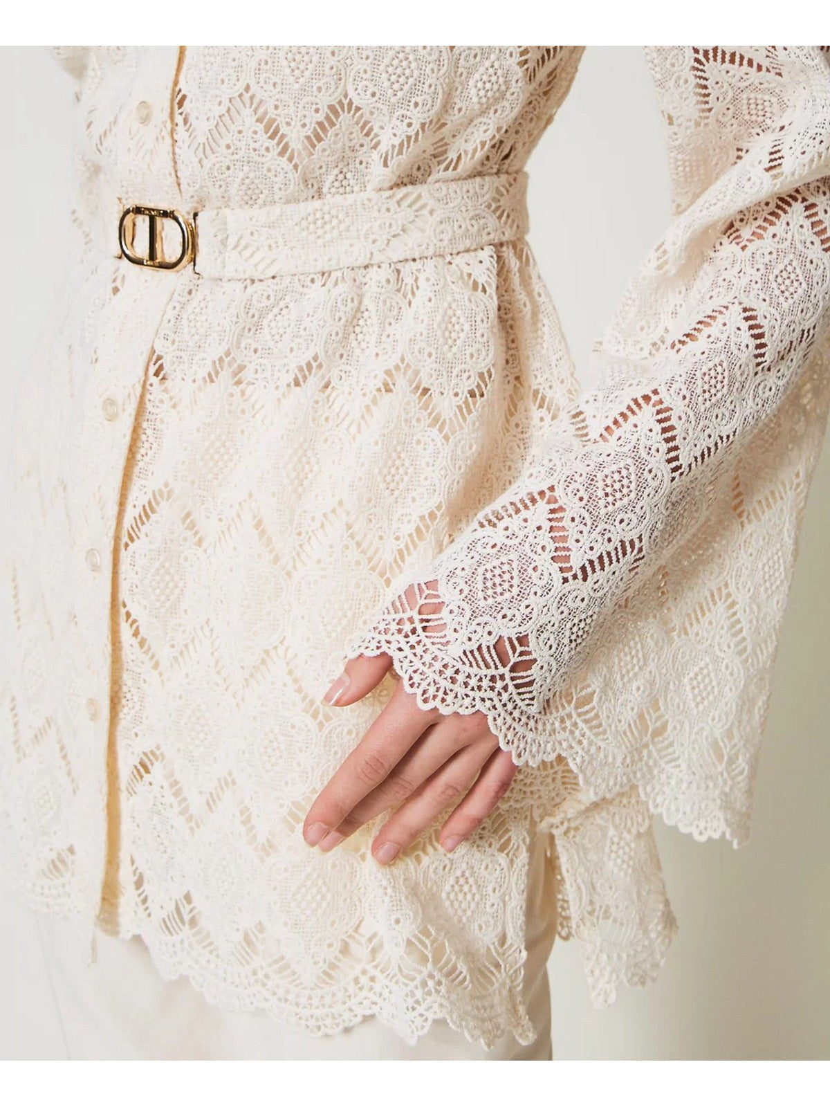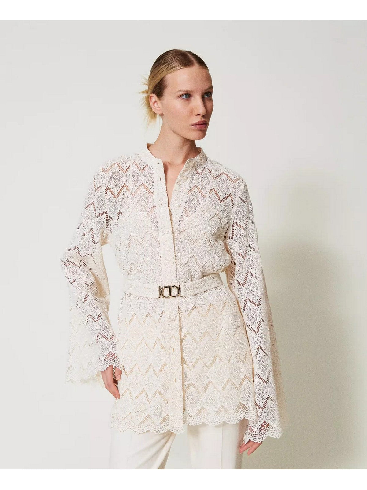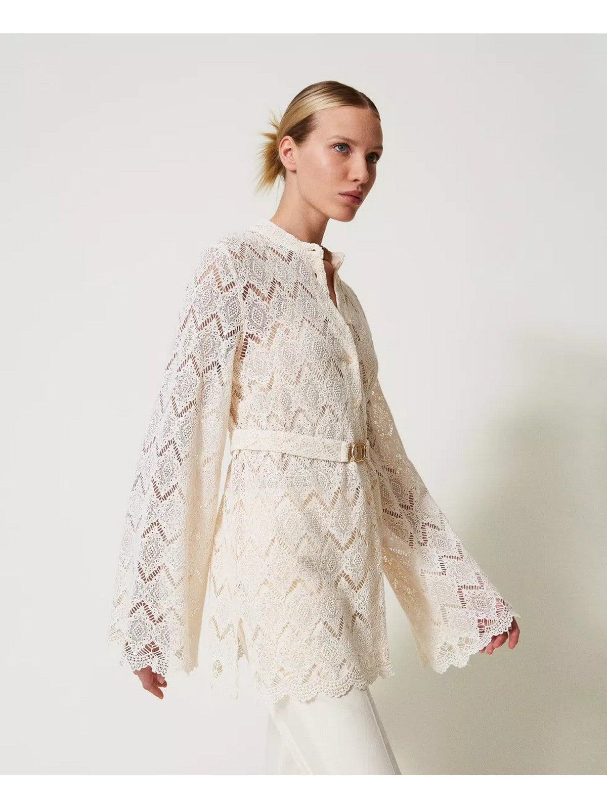Maxi camicia TWINSET in pizzo macramè con disegno geometrico e cintura rimovibile con elastico interno e fibbia Oval T dorato