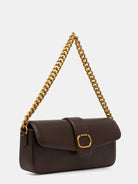 ? Doppia tracolla con portabilità a spalla: una in pelle regolabile tramite bottoni automatici e una in catena metallica, galvanica color oro satinato.
