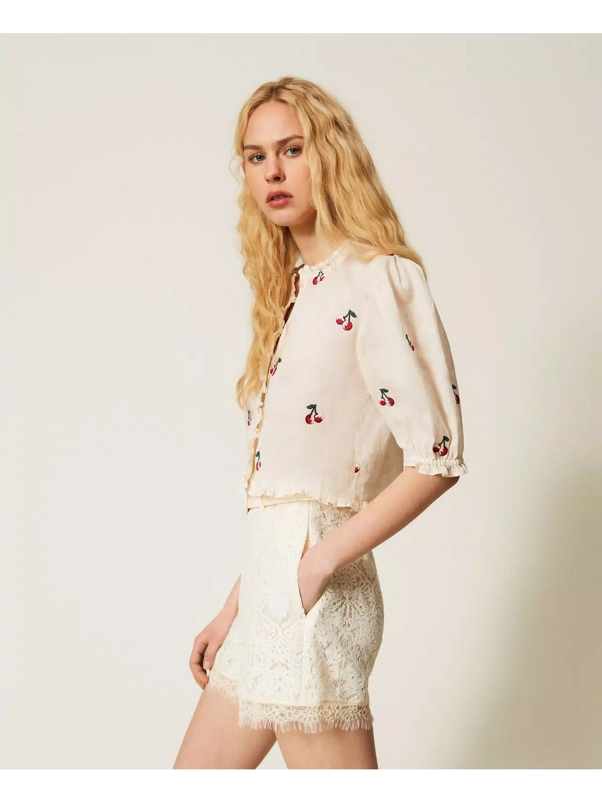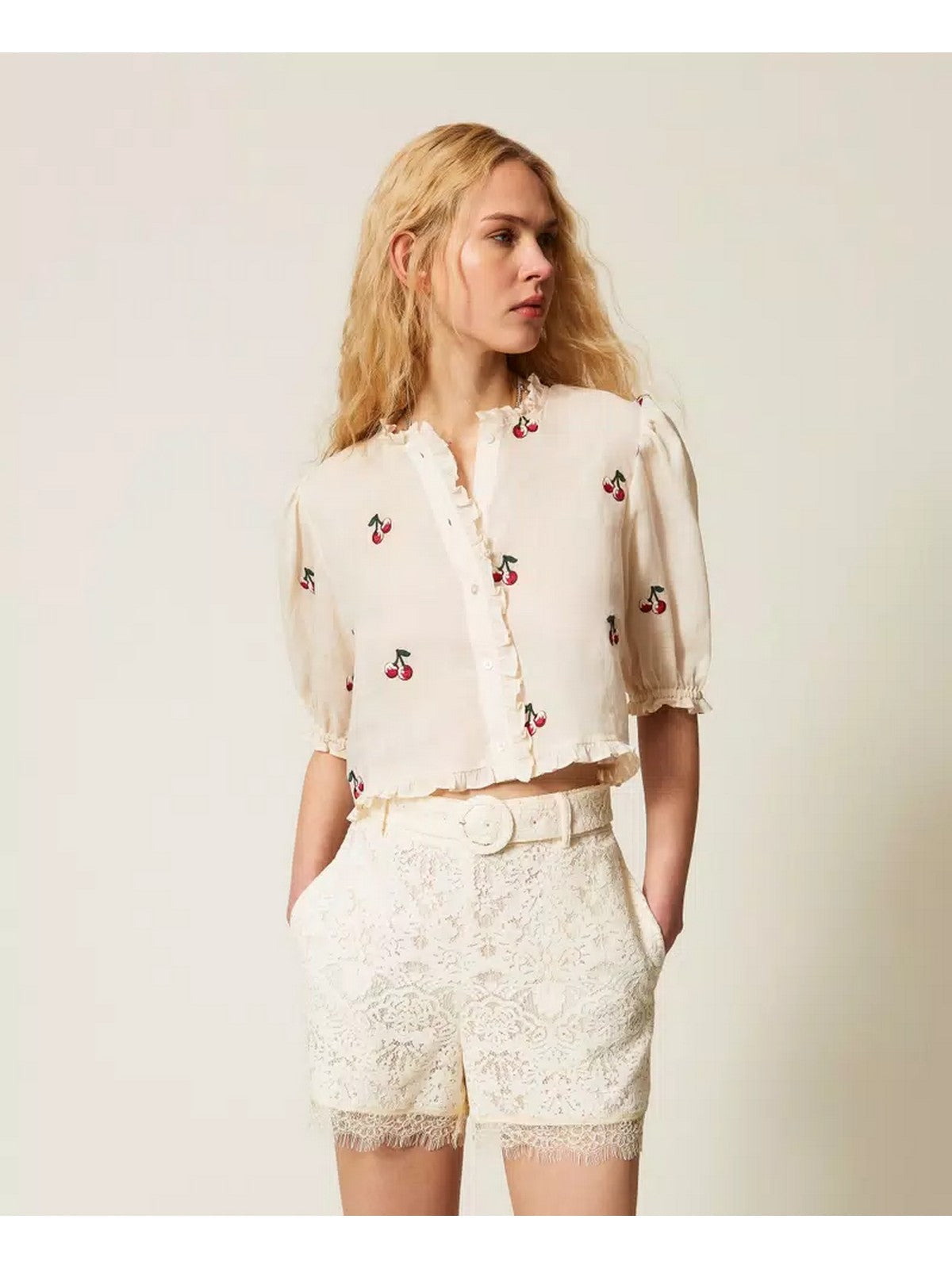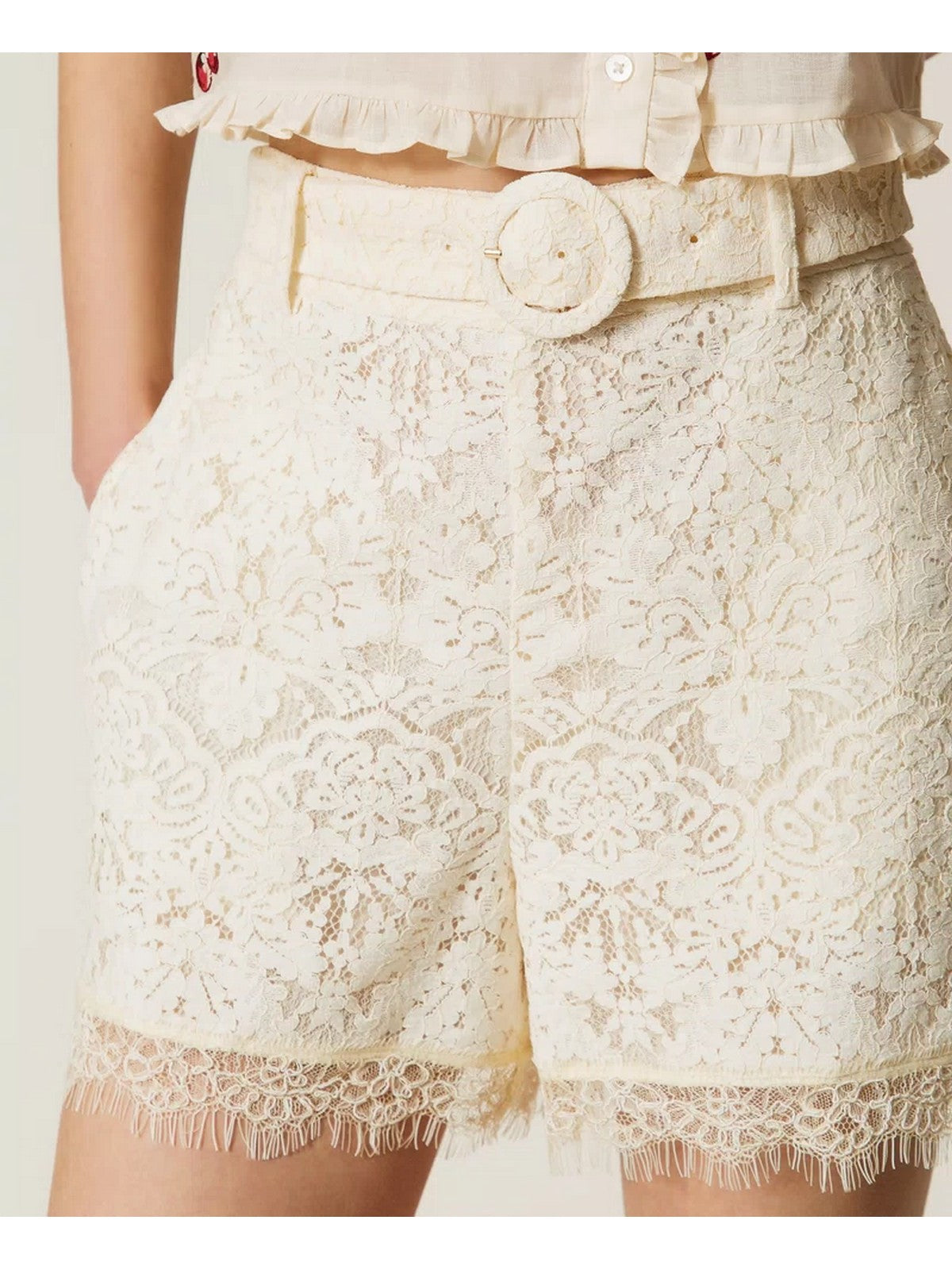 Shorts TWINSET in pizzo con passamaneria smerlata al fondo.