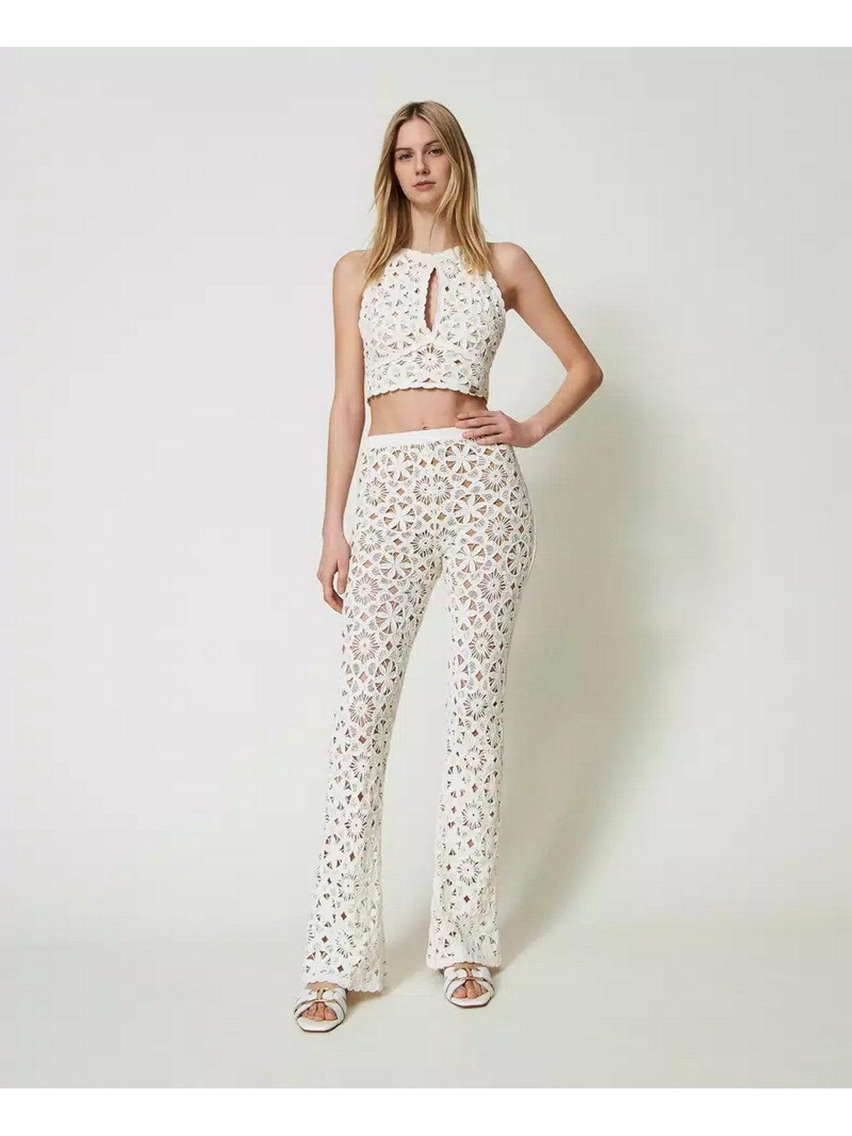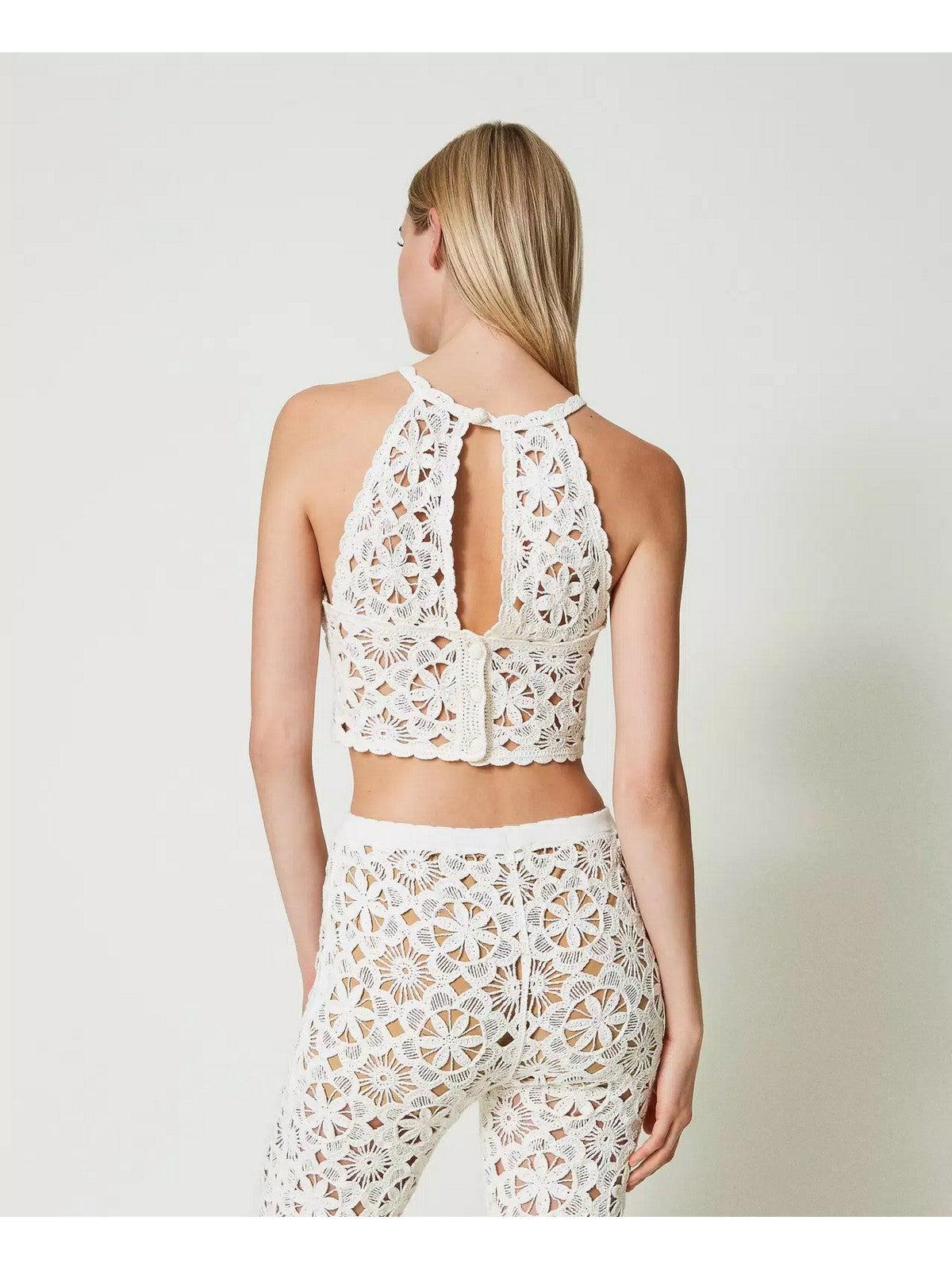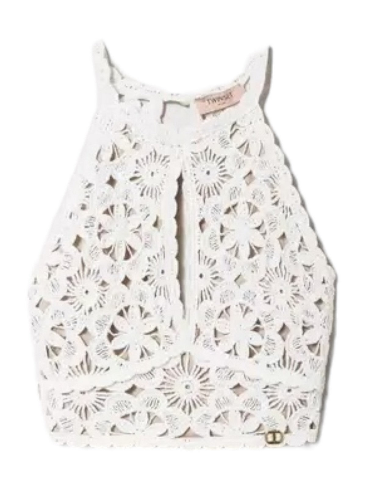 Top cropped TWINSET in maglia di cotone con lavorazione crochet a fiori con profili smerlati. Scollo halter con apertura a goccia sul fronte. Chiusura con bottoni ricoperti sul retro. Placchetta logo Oval T al fondo.