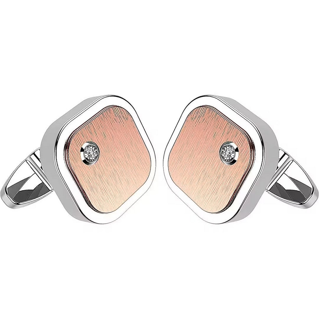 Gemelli da uomo di Zancan della collezione hi teck. Gioiello in acciaio 316l e zaffiri bianchi. Gemelli costituito da acciaio 316l medicale lucido e satinato, trattamento pvd in oro rosa di colore oro rosa. La referenza è ehg042